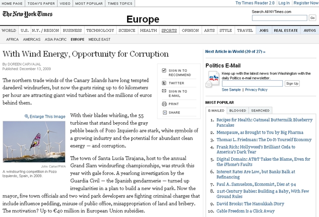 "Tráfico de influencias, apropiación indebida de terras, suborno, ... A motivación? Até 40 millóns de euros en subvencións da UE", salienta o rotativo en referencia ao caso canario na peza titulada "With Wind Energy, Opportunity for Corruption" ("Coa enerxía eólica, oportunidade para a corrupción"), publicada este domingo (en papel, o luns, no The International Herald Tribune, edición internacional do NYT).