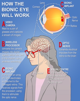 O chamado "ollo biónico" conta cunha microcámara que, localizada sobre unha lente, fai captura das imaxes e envíaas a un procesador. Á súa vez, este trebello envía sinal a un dispositivo dentro da retina da persoa que estimula neuronas vivas que comunican as imaxes ao cerebro.