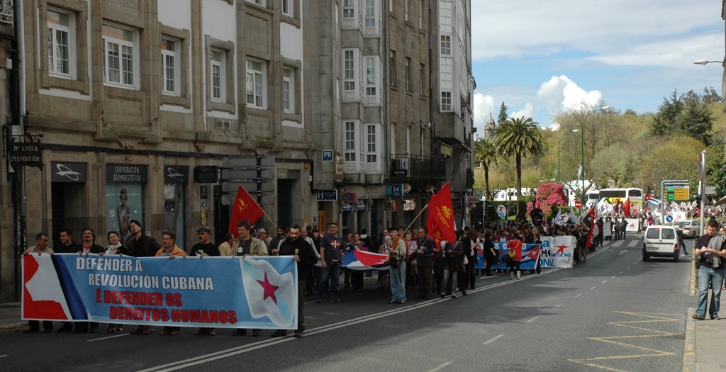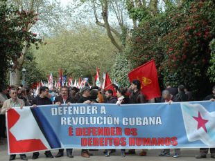 Durante o percorrido, os participantes corearon frases para denunciar unha nova campaña mediática de condena á illa e defender a revolución cubana. Esa campaña, xurdida a raíz da morte en folga de fame de Orlando Zapata, cala, segundo as organizacións convocantes da mobilización, os innumerábeis casos de gravísimas violacións dos dereitos humanos que cometen os estados europeos e polos EUA.